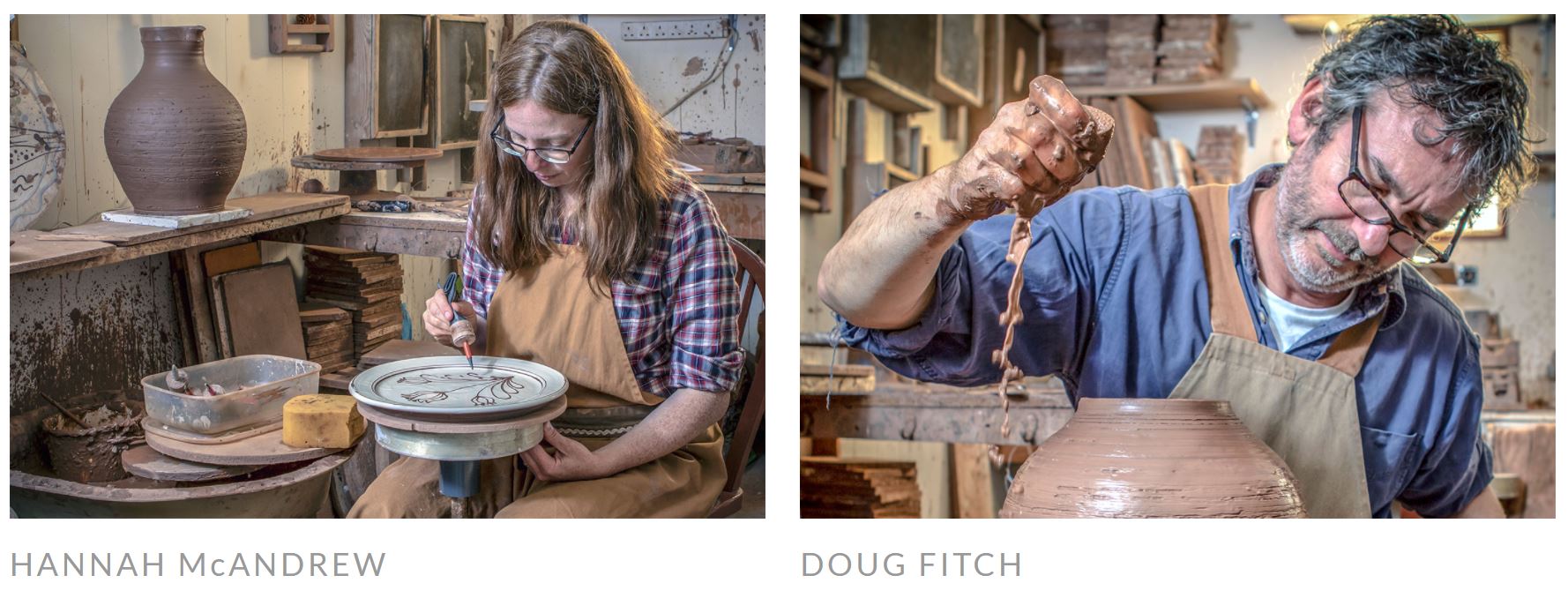 Ovaj par keramičkih umjetnika koristi tehniku ukrašavanja slipom, mekanim tekućim premazom gline koji se nanosi na površinu. Slip je mješavina gline i vode koju se dodaju drugi sastojci radi boje. Slip se nanosi na posudu dok je u stadiju tvrdoće kože. Za više informacija o ovim umjetnicima posjetite njihovu web stranicu https://fitchandmcandrew.co.uk/