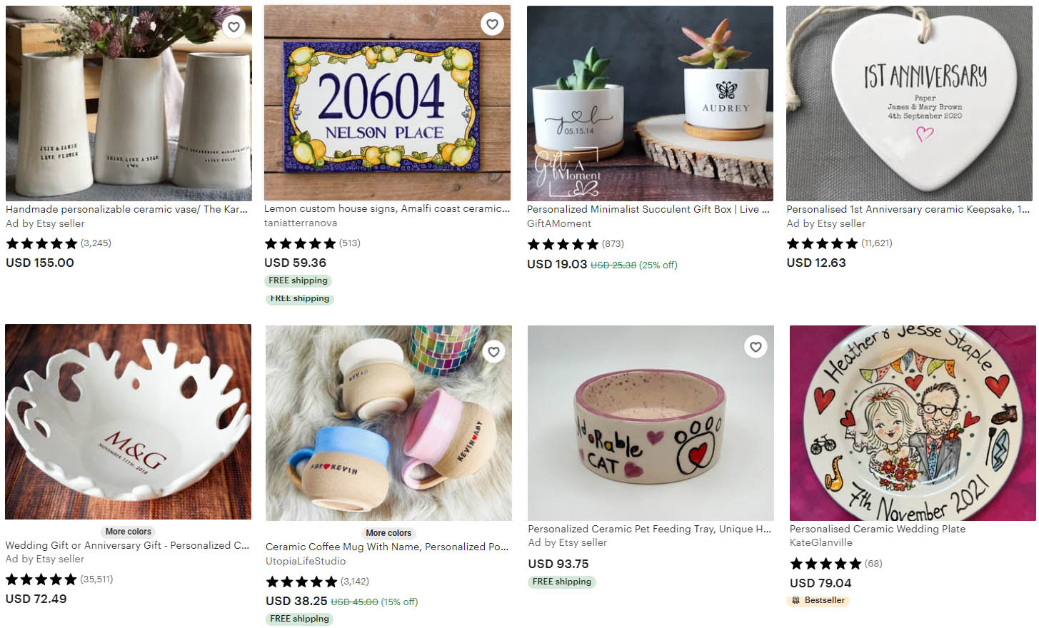 Za Etsy kažu da je vodeća tvrtka za e-trgovinu usmjerena na unikatne, ručno izrađene ili vintage predmete. Tamo se predmeti se prodaju u širokom rasponu kategorija, uključujući nakit, torbe, odjeću, kućni dekor i namještaj, igračke, umjetnost itd. Uz Etsy možete pronaći kupce na globalnom tržištu. Također, to je odlična prodajna platforma na kojoj možete provjeriti što se dobro prodaje i koliko vi možete naplatiti svoj keramički proizvod.